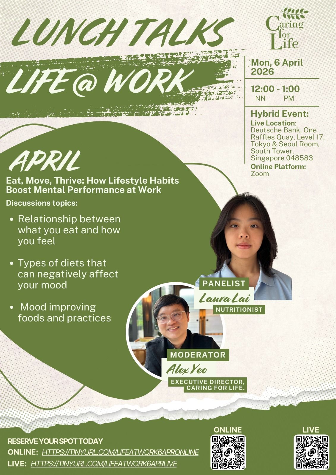 Caring for Life is running our Lunch Talks: LIFE@WORK (April edition) — a lunchtime session on how lifestyle habits affect our mood, focus, and mental performance at work. |