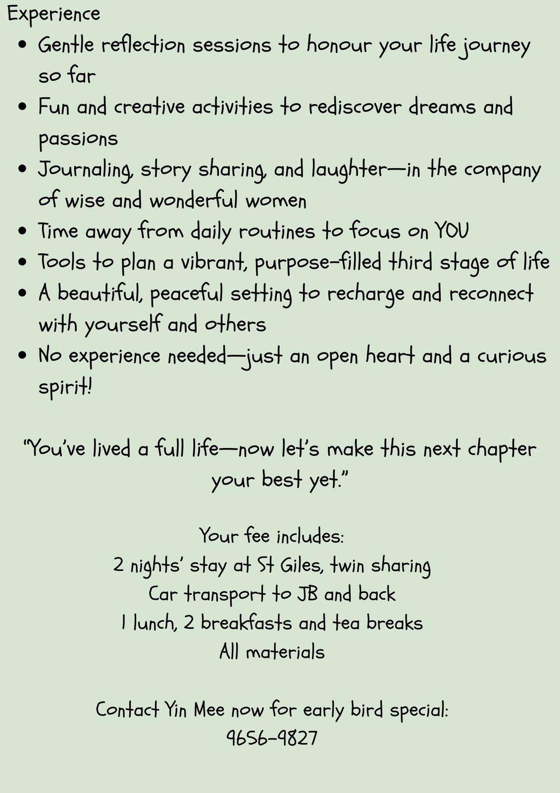 Join a community of warm-hearted women for a gentle inspiring retreat designed just for you. Together, we’ll reflect on the paths we’ve walked, celebrate our stories and explore the possibilities ahead. Whether you’re embracing retirement, reinventing yourself, or simply curious about what’s next, this retreat offers encouragement, tools, and connection for the road ahead. Because the third stage of life is not an ending -it’s an invitation.